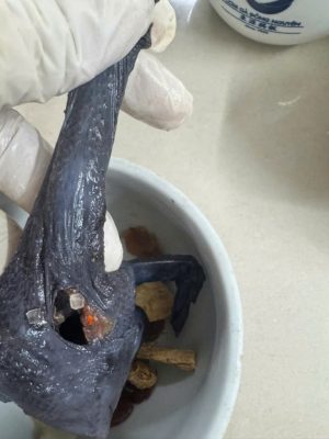 * Cho gà ác vào nồi, thêm thuốc bắc, gừng và đổ lượng nước vừa đủ ngập gà.