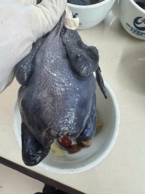 * Gà ác rửa sạch, xát muối và gừng để khử mùi tanh, sau đó rửa lại bằng nước sạch.